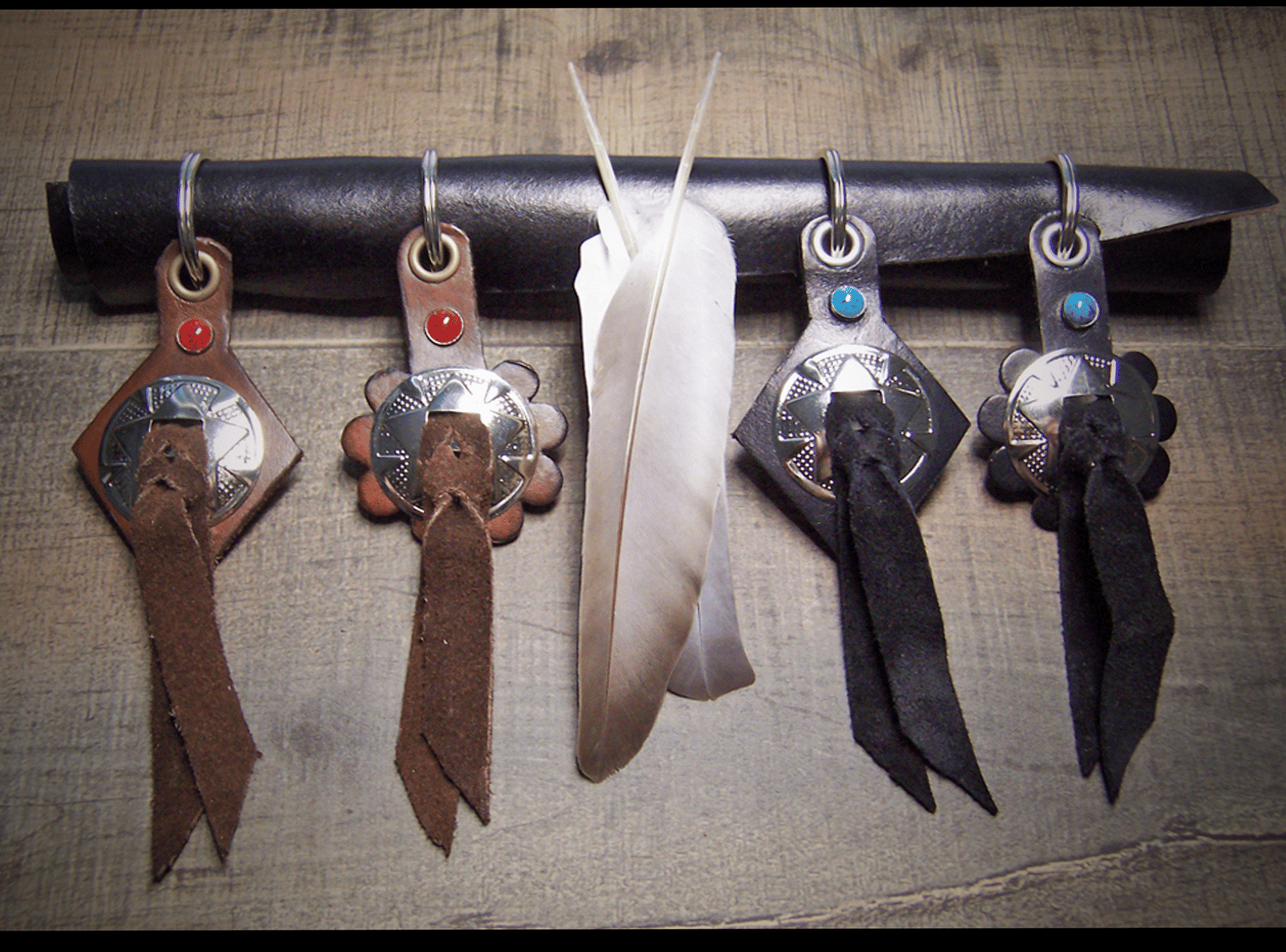 These key chains are my exclusive design, 8oz. full grain leather, chrome concho and faux turquoise or coral rivets finished in satin black or bison brown. Demensions are approximately 6" L x 2" W.
