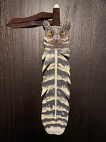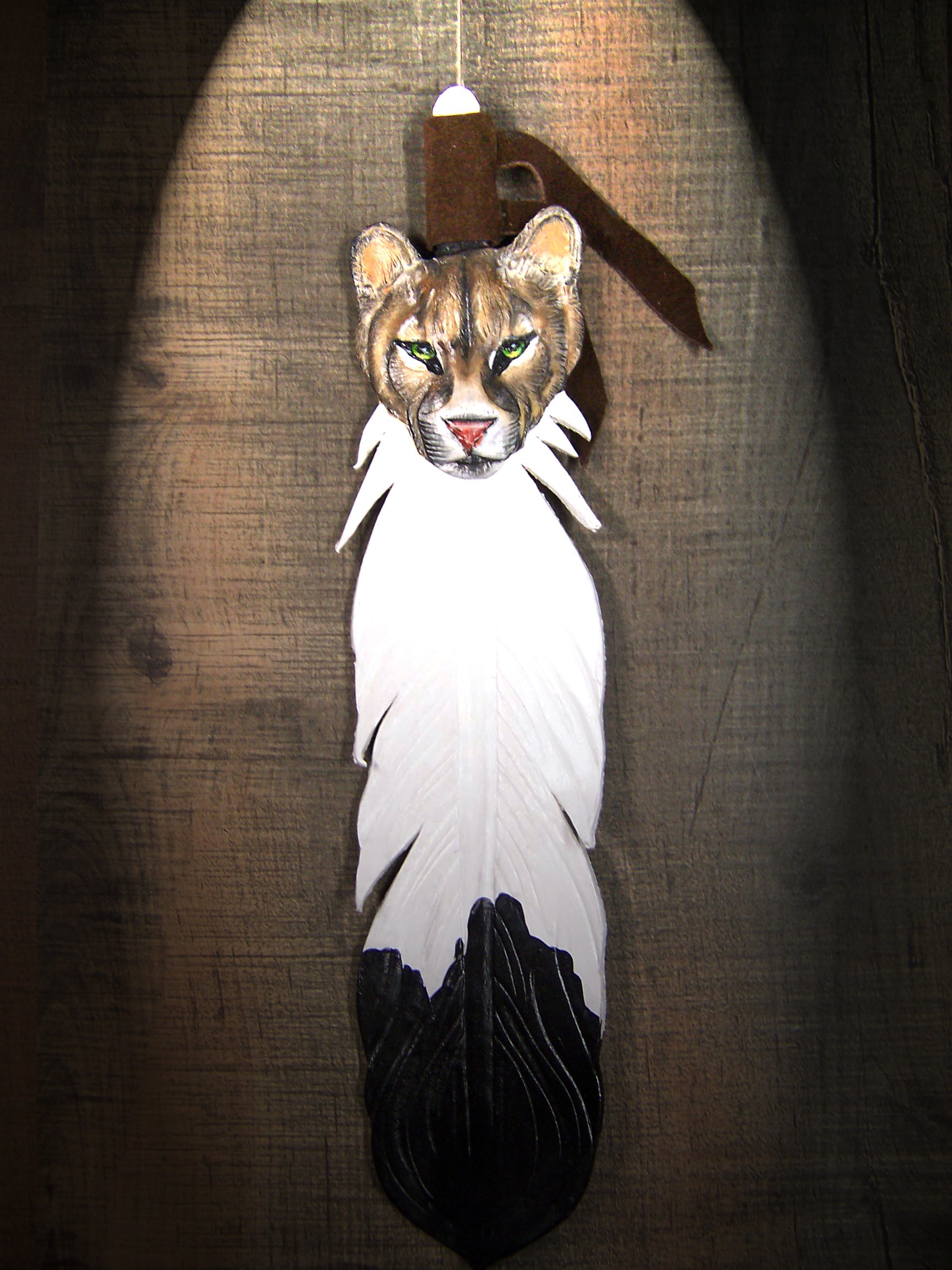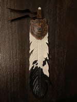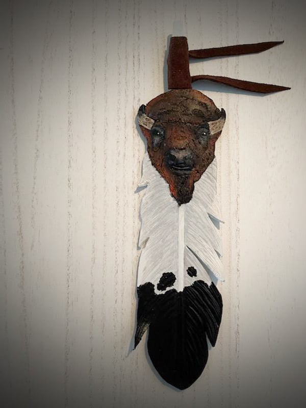 These faux leather feathers are my exclusive designs. Hand carved and painted, dimensions are 12 inches by 2 1/2 inches wide.
