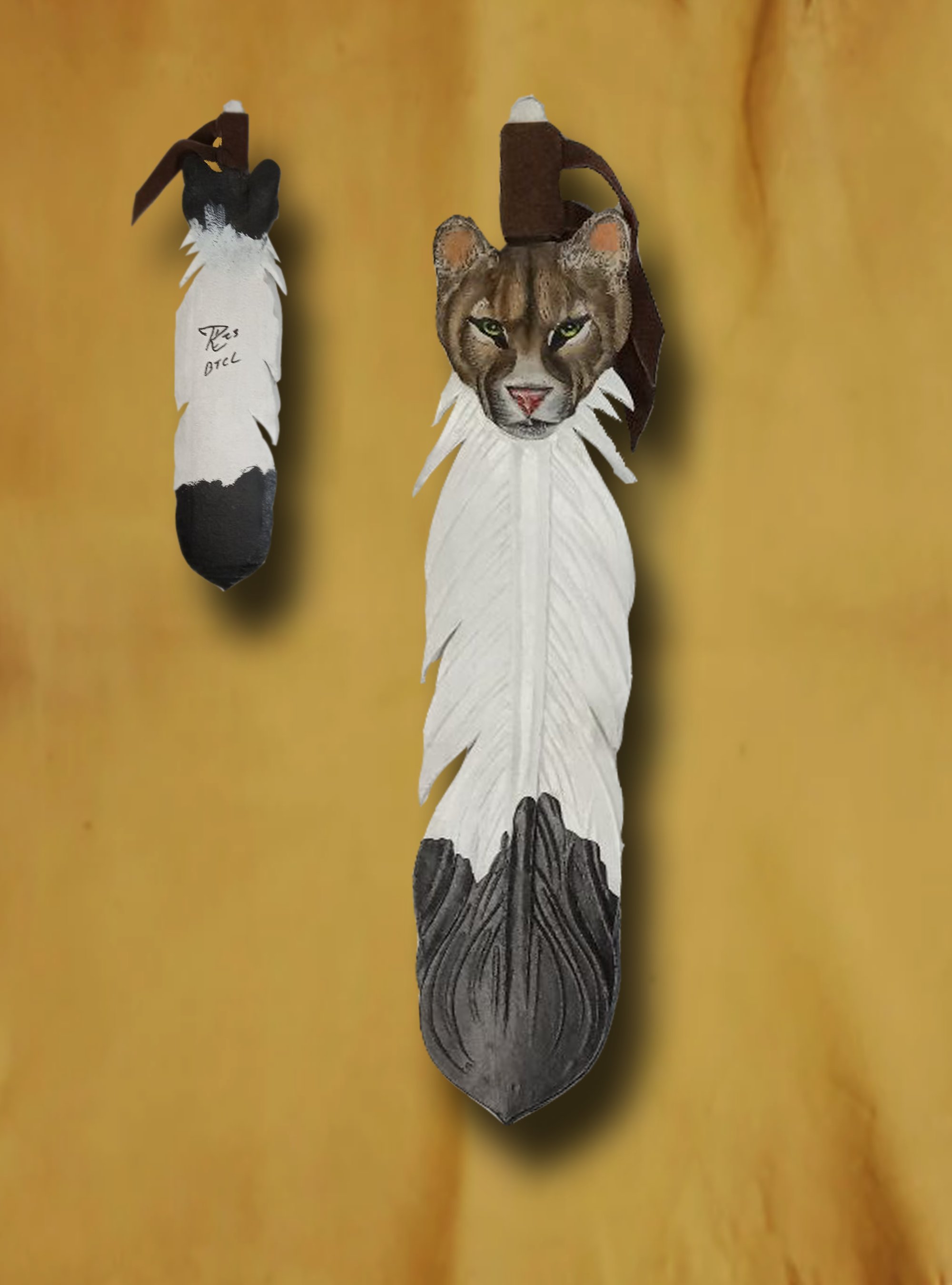 These faux leather feathers are my exclusive designs. Hand carved and painted. Dimensions are 12" L x 2.5" W. Great for room accents, Hangs easily, excellent for the person that has everything!