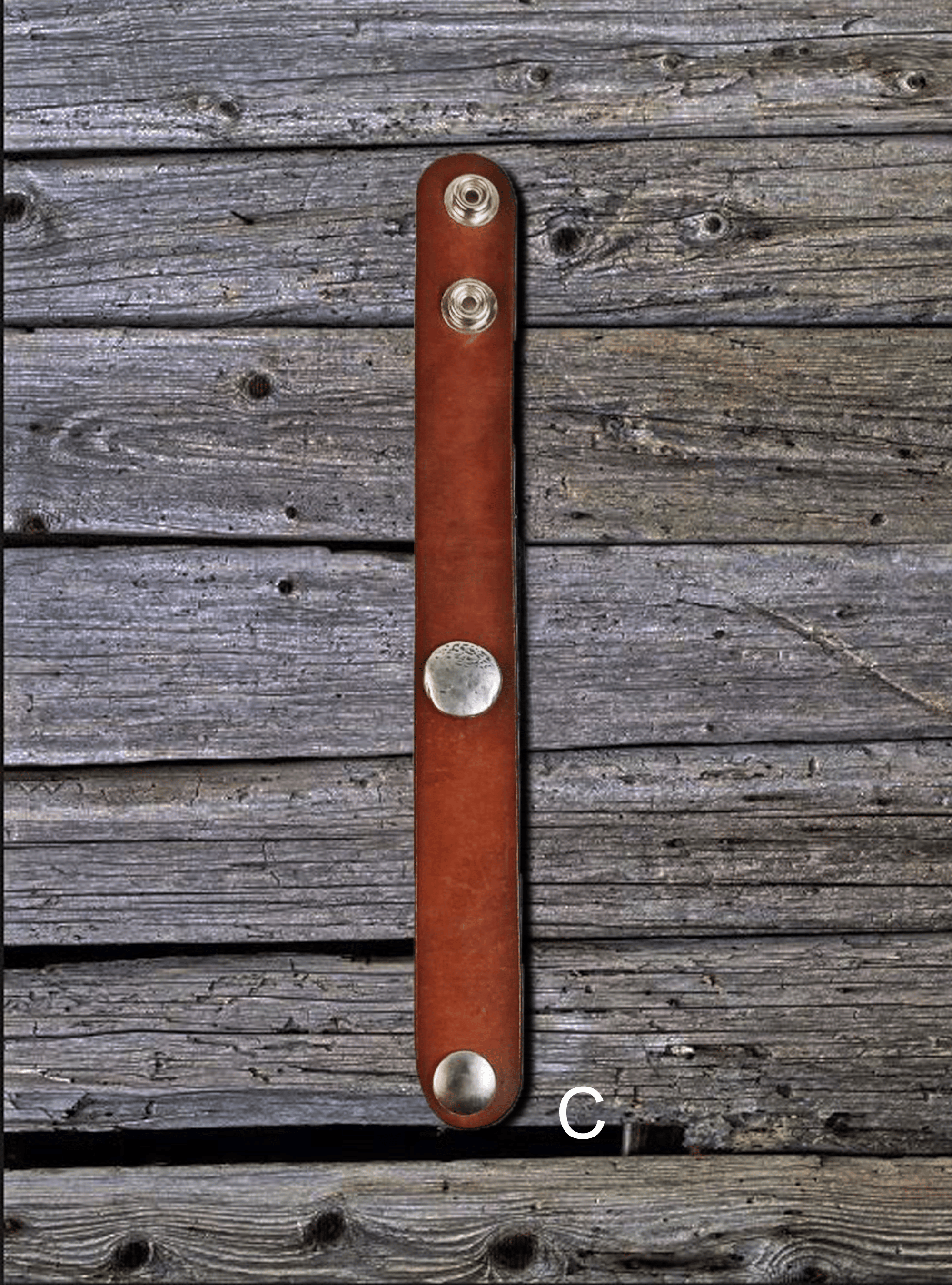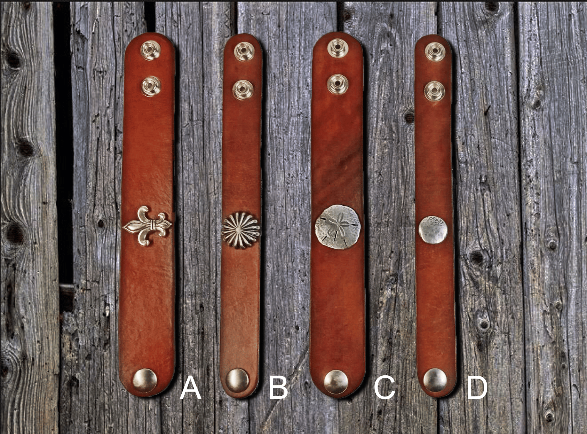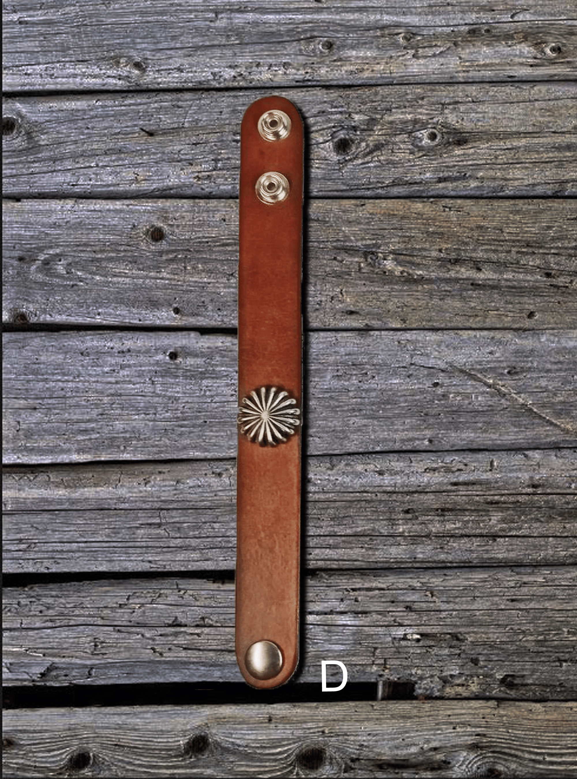 These bracelets are 6 oz. top grain leather, finished in bison brown with a screw type concho, dimensions can adjust from approximately 7.5" to 8.5" wrist.