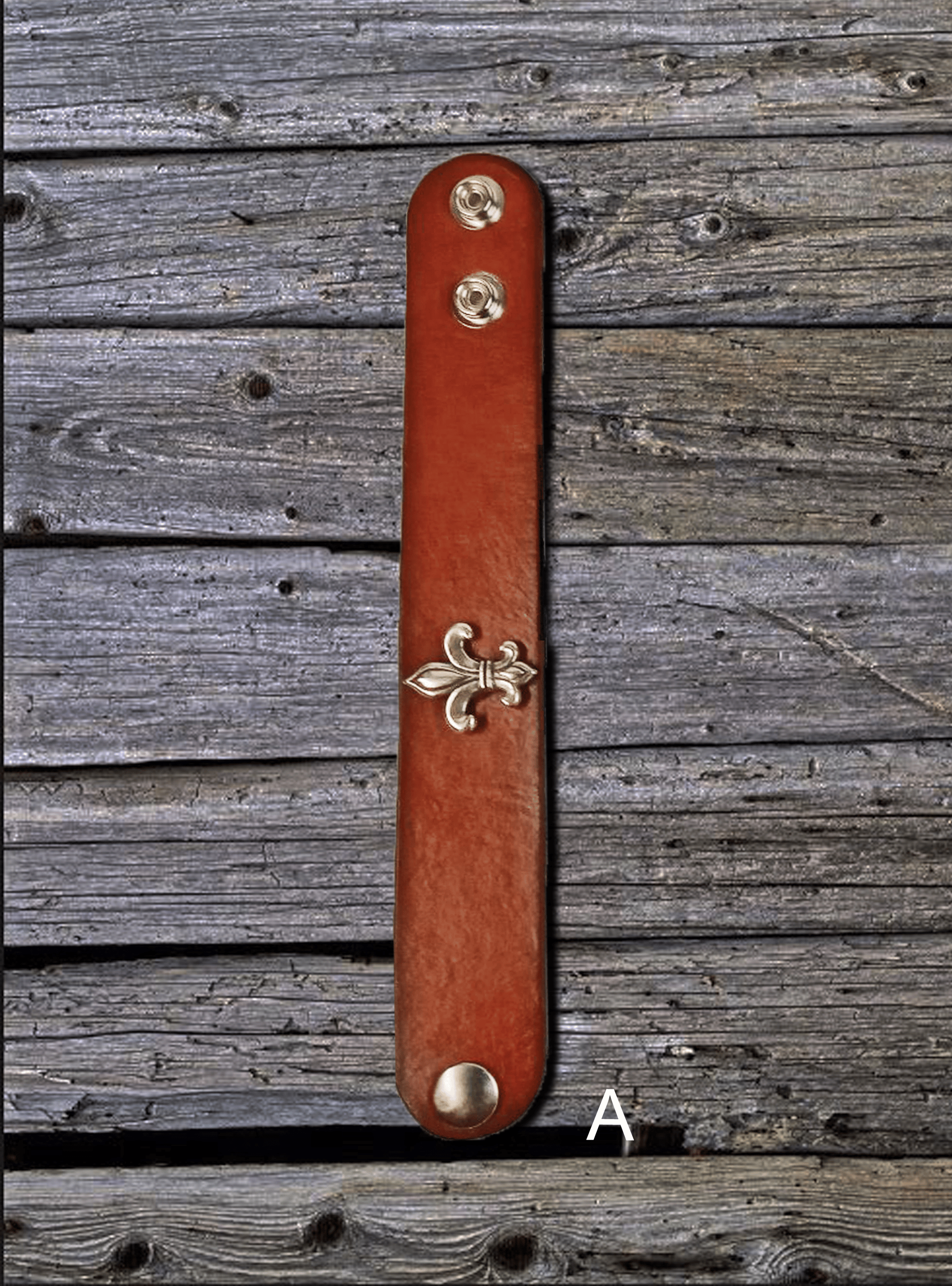 A. 1.5" W cuff and has a 1.25" fleur de lis concho.