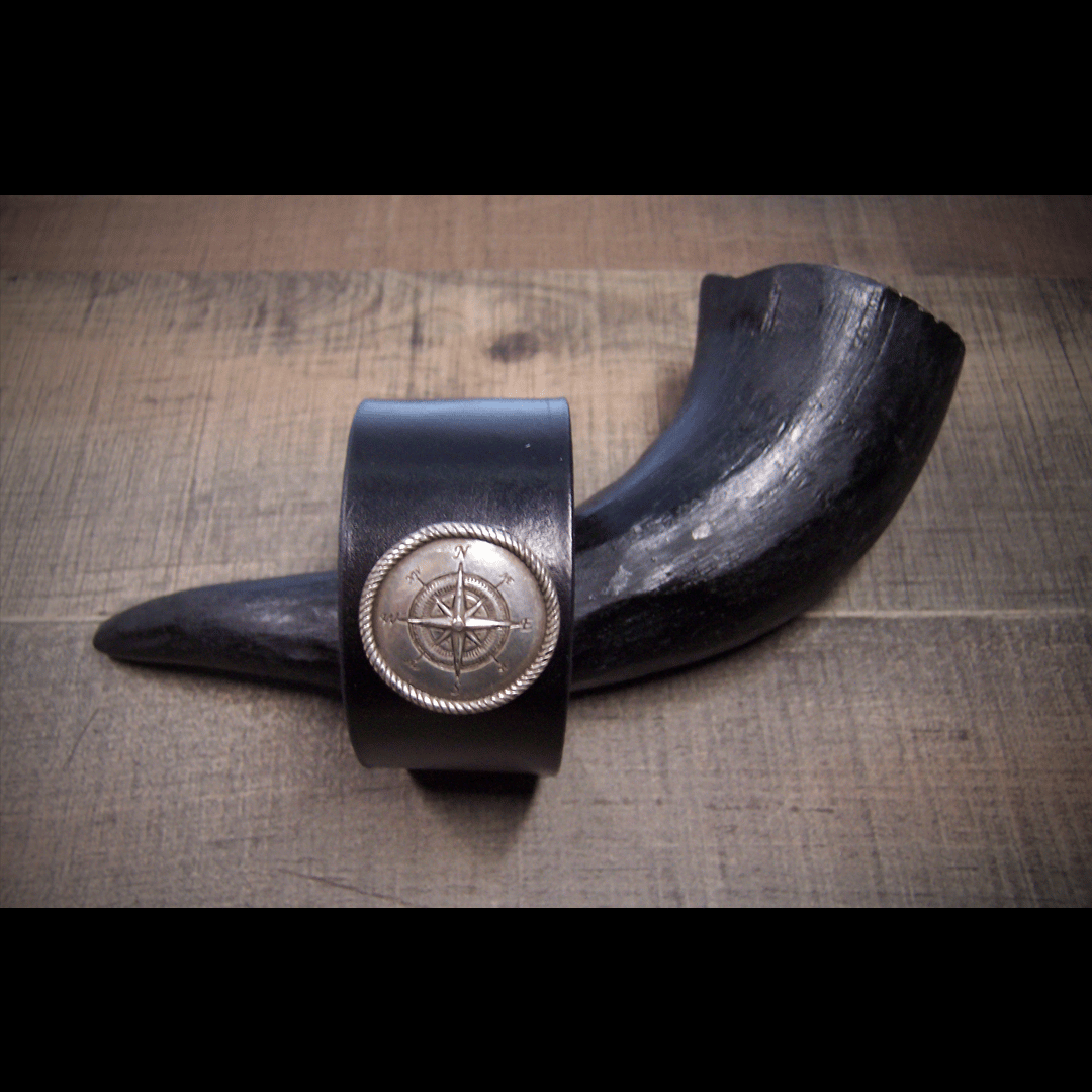 These bracelets are 6 oz. full grain leather, finished in Marine black with a 1 inch concho, dimensions are 1 3/8 inch wide and can adjust from a 7 1/2 to 8 1/2 inch wrist.