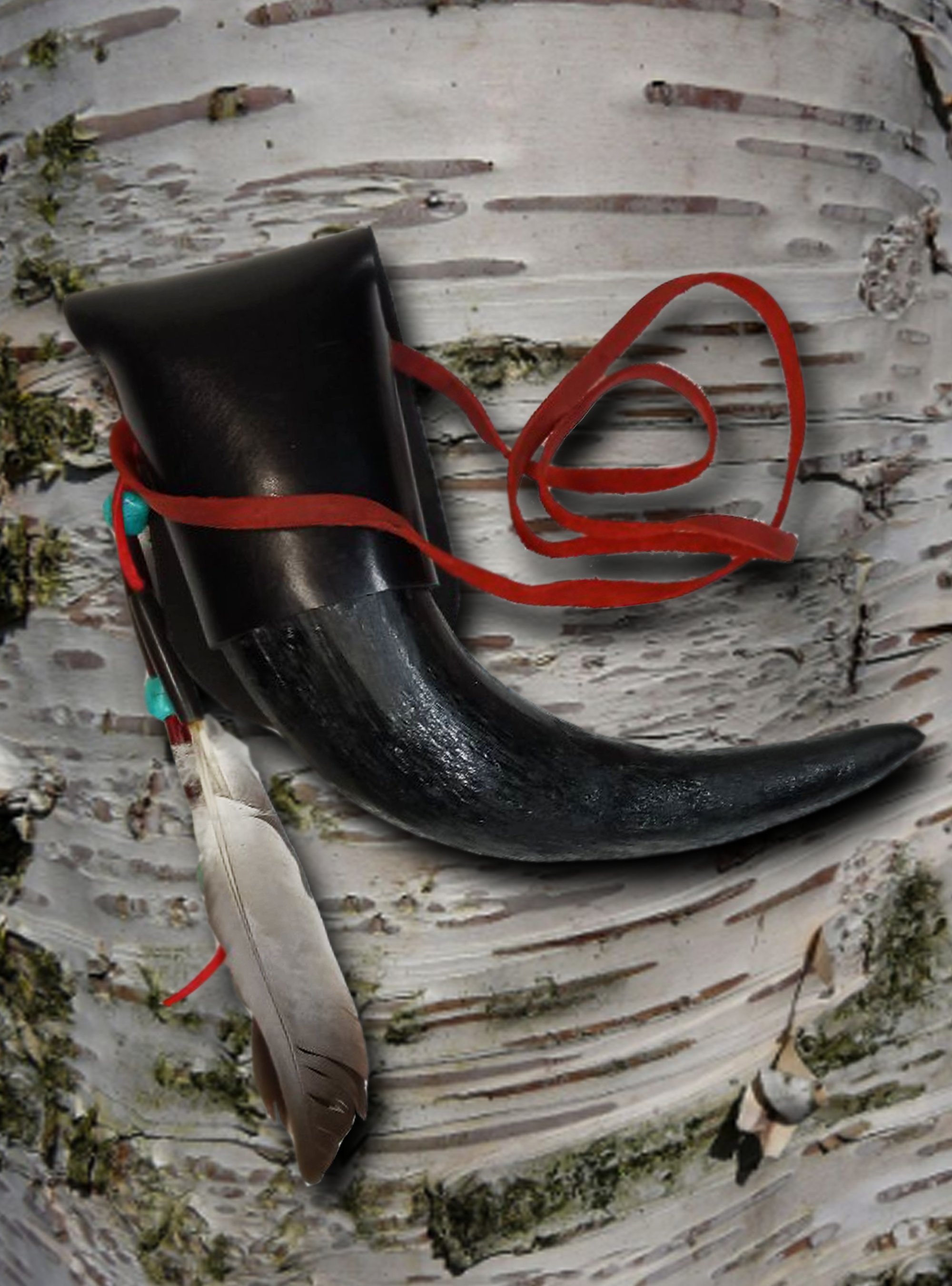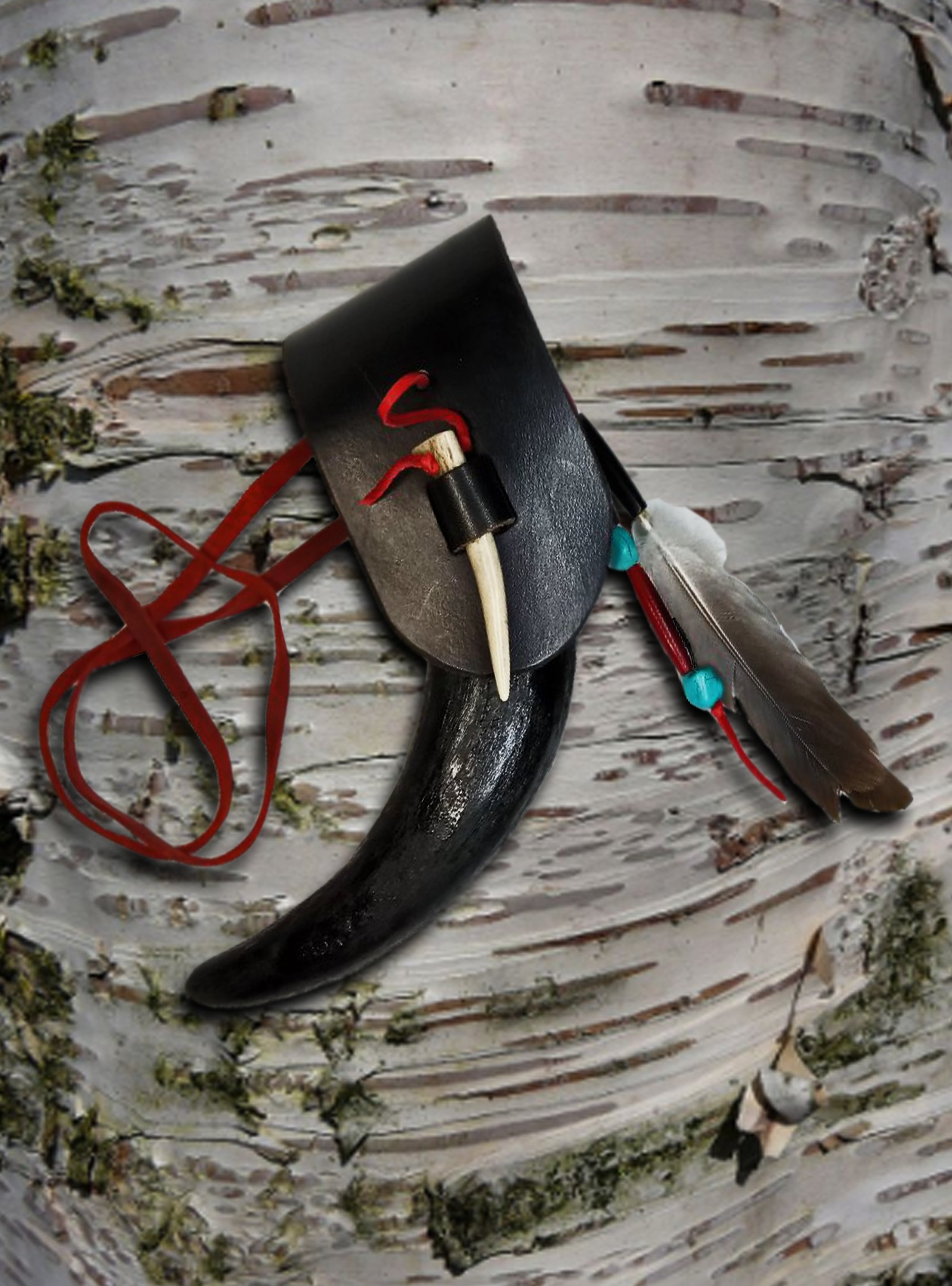 This is my exclusive design finished in satin black with genuine buffalo horn, stag horn, feathers, bison bone and faux turquoise. Dimensions are approximately 7" L x 1.75" round. Use as a decoration or carrying small items with mountain man style!!