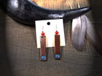 These earrings are made from surgical stainless steel, full grain leather with genuine turquoise or coral beads. Dimensions are 1/4 inch by 2 1/2 inches long.